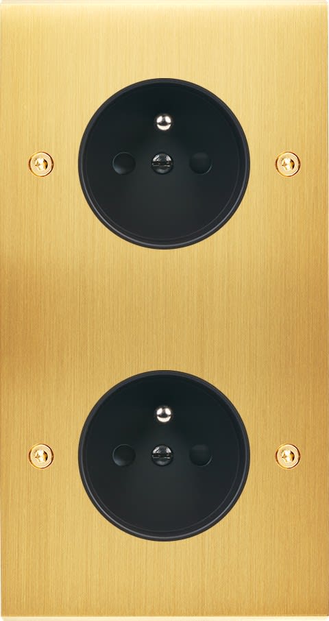 Façade Confidence en laiton massif finition Satiné double verticale prise de courant 2P+T prise de courant 2P+T . Façade à vis. Dimensions 80x151x5mm. Fabriqué en France.
