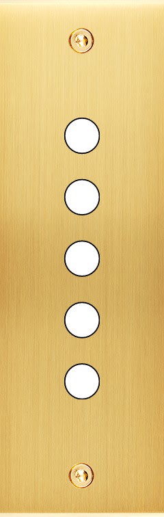 Façade Confidence en laiton massif finition Satiné étroite longue 5 boutons poussoir PUSH. Façade à vis. Dimensions 40x126x5mm. Fabriqué en France.