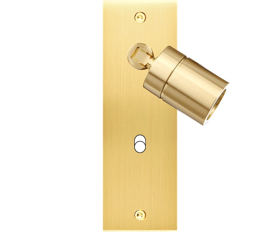 Laiton massif 5mm - 40x125mm - Montage sur boîtiers d'encastrement standards ⌀32mm profondeur 50mm - Façade à vis - Compatible avec les mécanismes renforcés MODELEC - Transformateur 220-12V inclus - LED Blanc chaud 2700K - Consommation LED: 2 Watts - 140/170 Lumens
