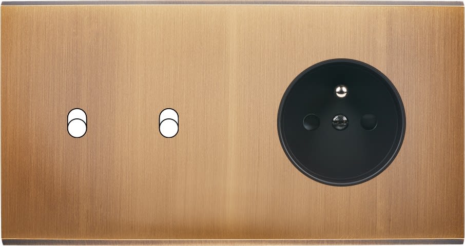 Laiton massif 5mm - 151x80mm, horizontal ou vertical - 12 finitions disponibles et plus de 50 fonctions - Montage sur boîtiers standards profondeur 50mm - Montage aimanté ou à vis
