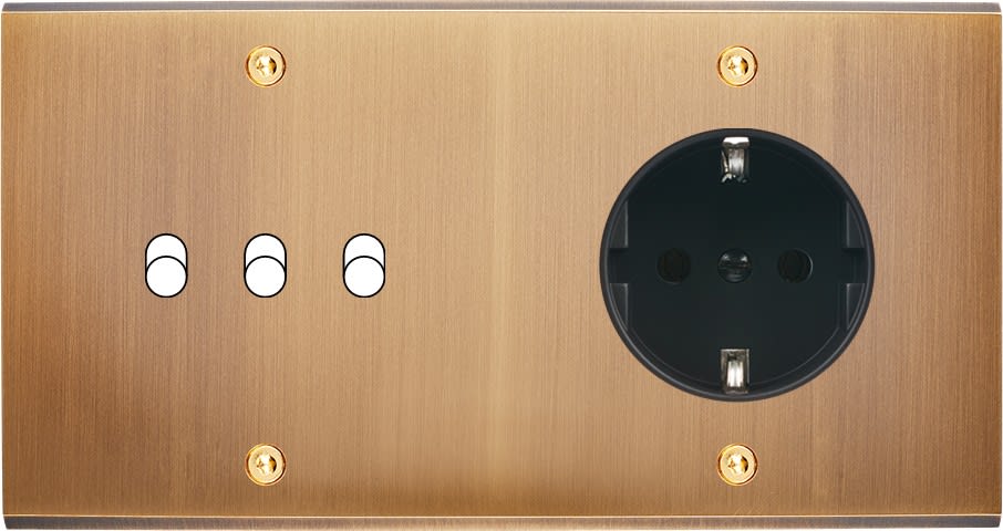 Laiton massif 5mm - 151x80mm, horizontal ou vertical - 12 finitions disponibles et plus de 50 fonctions - Montage sur boîtiers standards profondeur 50mm - Montage aimanté ou à vis