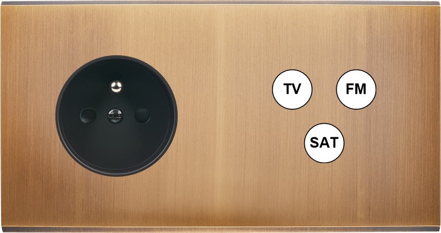 Façade Confidence en laiton massif finition Vieux Bronze double horizontale prise 2P+T TV-FM-SAT. Façade magnétique. Deux chanfreins biseautés. Dimensions 151x80x5mm. Fabriqué en France.