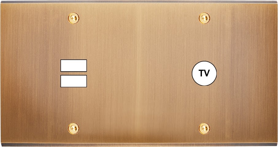Façade Confidence en laiton massif finition Vieux Bronze double horizontale ouverture pour chargeur double USB 1 TV. Façade à vis. Dimensions 151x80x5mm. Fabriqué en France.