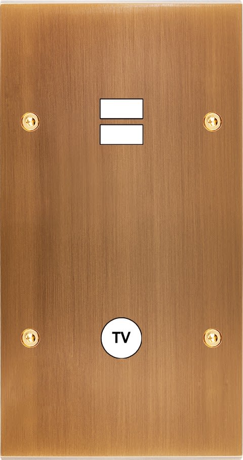 Façade Confidence en laiton massif finition Vieux Bronze double verticale ouverture pour chargeur double USB 1 TV . Façade à vis. Dimensions 80x151x5mm. Fabriqué en France.