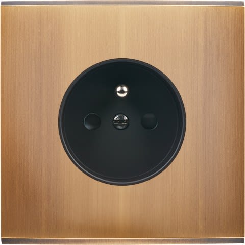 Façade Confidence en laiton massif finition Vieux Bronze simple prise 2P+T. Façade magnétique. Deux chanfreins biseautés. Dimensions 80x80x5mm. Fabriqué en France.