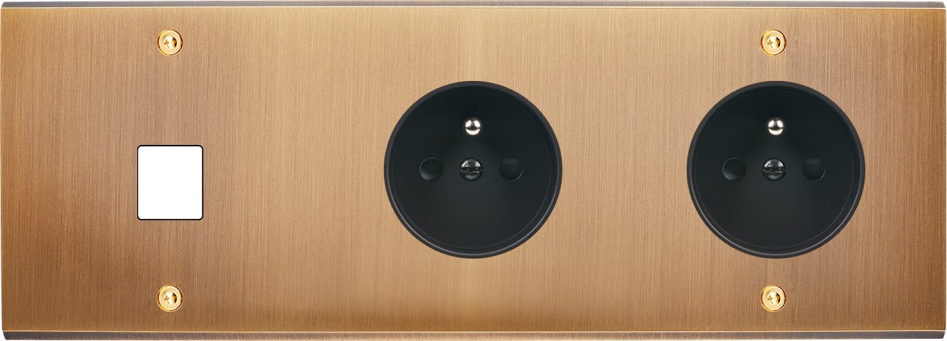 Façade Confidence en laiton massif finition Vieux Bronze triple horizontale 1 média prise de courant 2P+T prise de courant 2P+T . Façade à vis. Dimensions 222x80x5mm. Fabriqué en France.