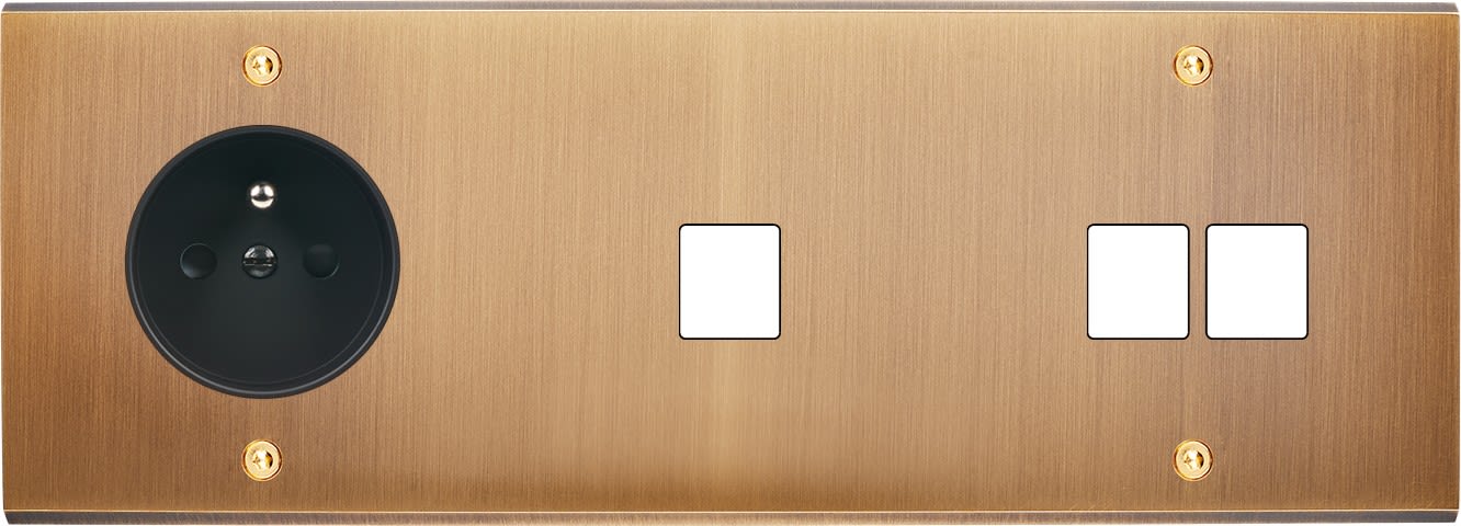 Laiton massif 5mm - Format triple horizontal 222x80mm - 12 finitions disponibles et plus de 50 fonctions - Montage sur boîtiers standards profondeur 50mm - Façade à vis