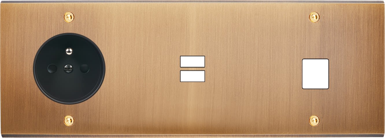 Laiton massif 5mm - Format triple horizontal 222x80mm - 12 finitions disponibles et plus de 50 fonctions - Montage sur boîtiers standards profondeur 50mm - Façade à vis
