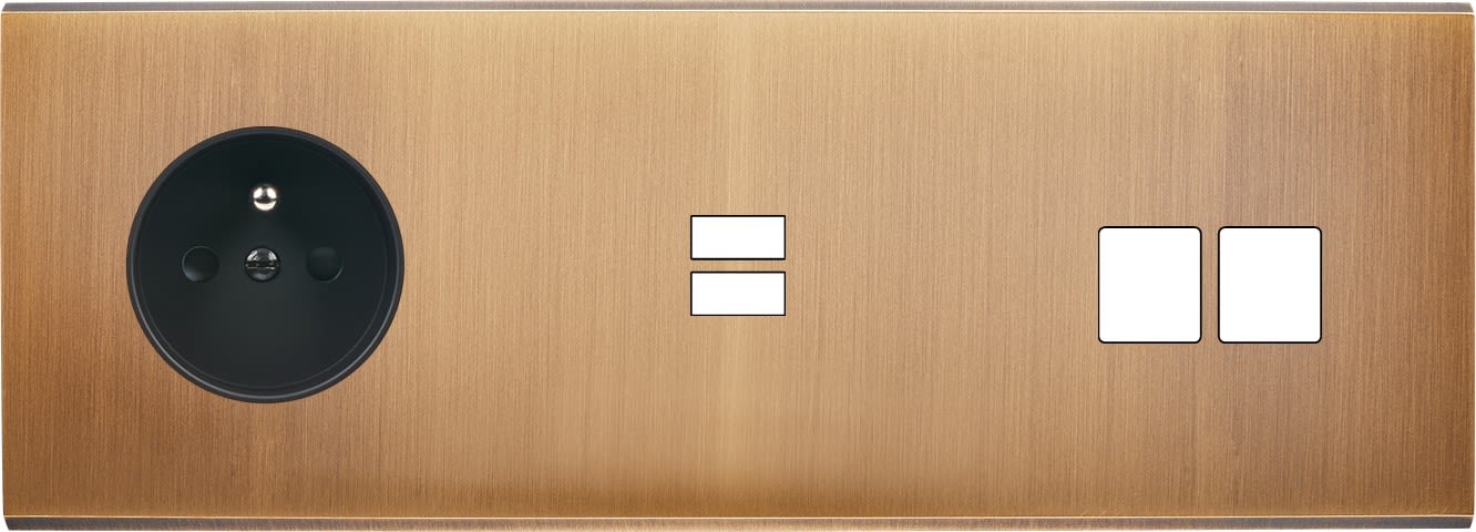 Laiton massif 5mm - 222x80mm, horizontal ou vertical - 12 finitions disponibles et plus de 50 fonctions - Montage sur boîtiers standards profondeur 50mm - Montage aimanté ou à vis