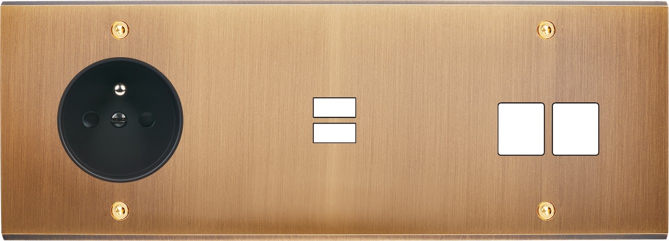 Façade Confidence en laiton massif finition Vieux Bronze triple horizontale prise de courant 2P+T ouverture pour chargeur double USB 2 média. Façade à vis. Dimensions 222x80x5mm. Fabriqué en France.