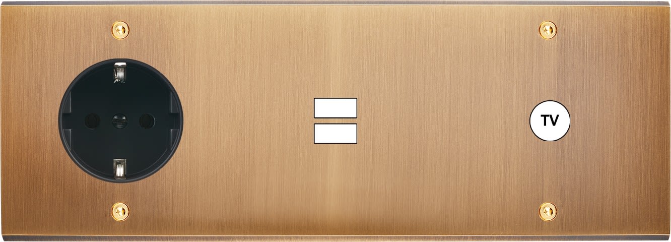 Façade Confidence en laiton massif finition Vieux Bronze triple horizontale prise schuko 2P+T ouverture pour chargeur double USB 1 TV vis