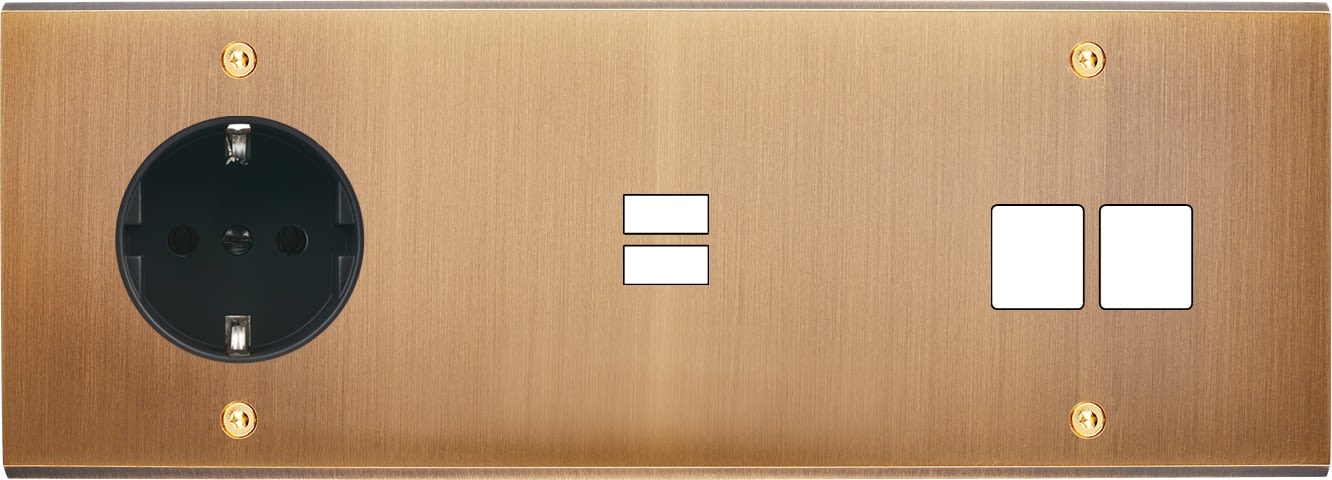 Laiton massif 5mm - Façade format triple horizontal 222x80mm - 12 finitions disponibles et plus de 50 fonctions - Montage sur boîtiers standards profondeur 50mm - Façade à vis - Compatible avec les mécanismes MODELEC renforcés ou standards à connexion automatique