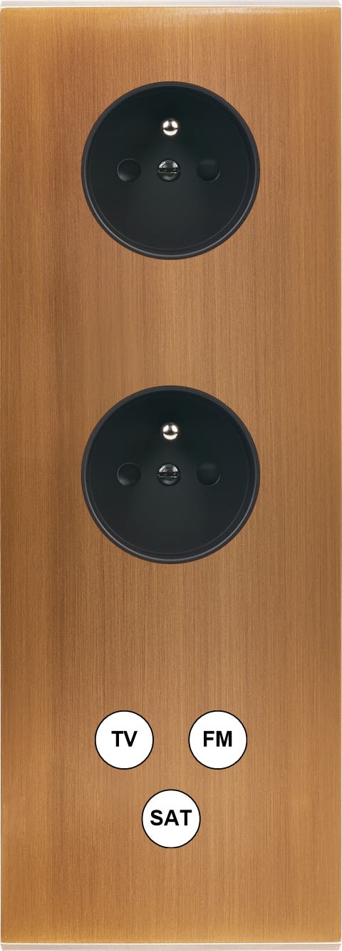 Façade Confidence en laiton massif finition Vieux Bronze triple verticale prise 2P+T prise 2P+T TV-FM-SAT. Façade magnétique. Deux chanfreins biseautés. Dimensions 80x222x5mm. Fabriqué en France.