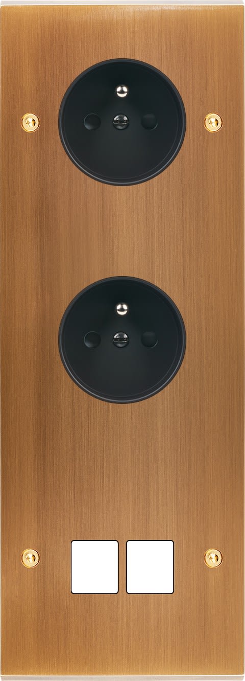 Laiton massif 5mm - 222x80mm, horizontal ou vertical - 12 finitions disponibles et plus de 50 fonctions - Montage sur boîtiers standards profondeur 50mm - Façade à vis