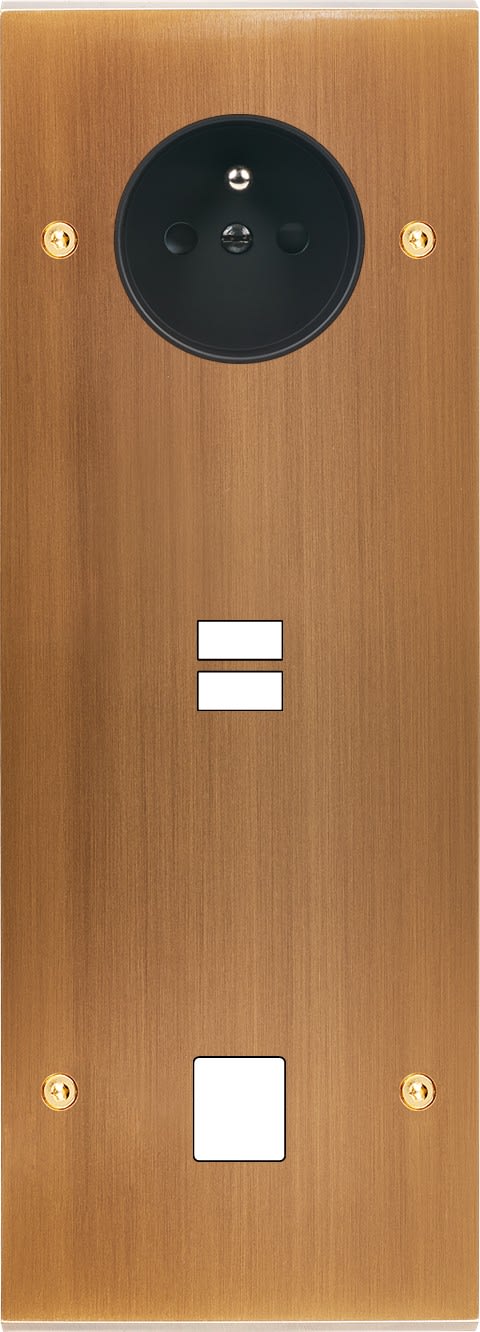 Façade Confidence en laiton massif finition Vieux Bronze triple verticale prise de courant 2P+T ouverture pour chargeur double USB 1 média. Façade à vis. Dimensions 80x222x5mm. Fabriqué en France.