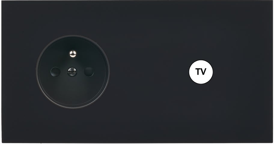 Façade Désir Noir Mat double Horizontale prise 2P+T 1 prise TV. Pose à clip. Dimensions : 151x80x6mm. Fabriqué en France