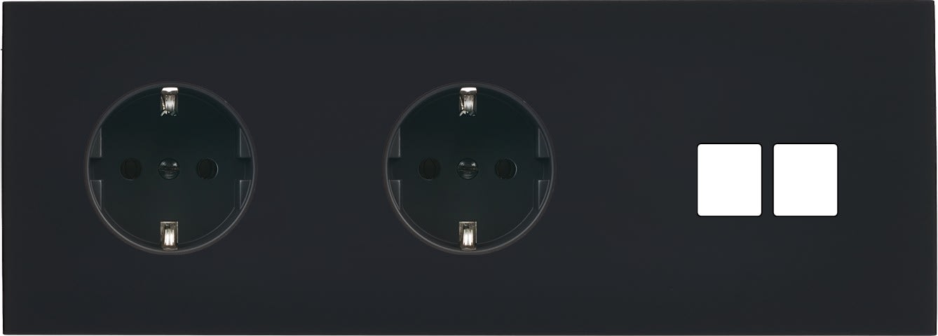 Façade Désir Noir Mat triple Horizontale 1 prise Schuko 1 prise Schuko 2 média. Pose à clip. Dimensions : 222x80x6mm. Fabriqué en France