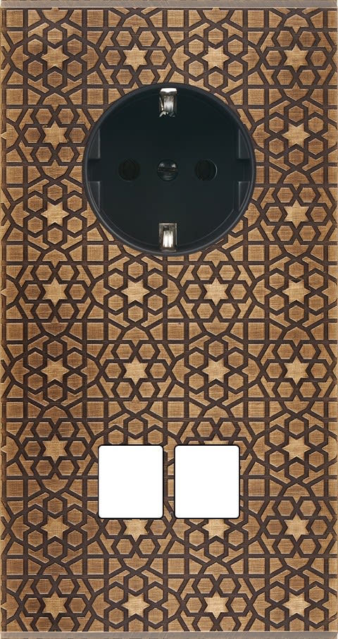 Façade Fascination en laiton massif finition Atlas double verticale 1 prise Schuko 2 MEDIA magnétique. Dimensions : 151x80x5mm, deux chanfreins biseautés. Fabriqué en France, dans les ateliers de Steaven Richard.