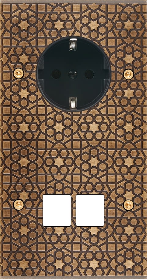 Façade Fascination en laiton massif finition Atlas double verticale 1 prise Schuko 2 MEDIA à vis. Dimensions : 151x80x5mm, deux chanfreins biseautés. Fabriqué en France, dans les ateliers de Steaven Richard.