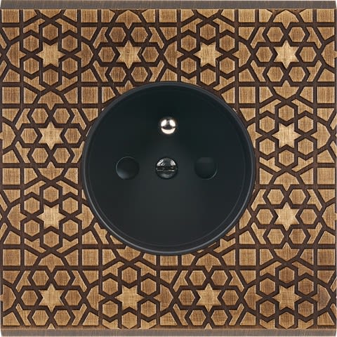 Façade Fascination en laiton massif finition Atlas simple prise 2P+T magnétique. Dimensions : 80x80x5mm, deux chanfreins biseautés. Fabriqué en France, dans les ateliers de Steaven Richard.