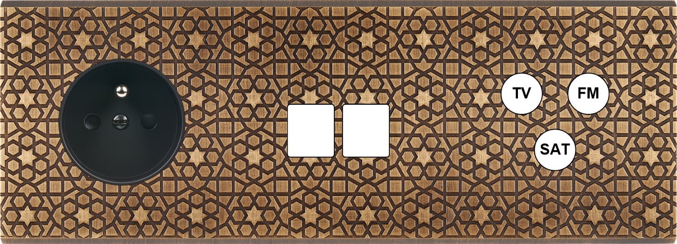 Façade Fascination en laiton massif finition Atlas triple horizontale prise 2P+T 2 Media TV-FM-SAT magnétique. Dimensions : 222x80x5mm, deux chanfreins biseautés. Fabriqué en France, dans les ateliers de Steaven Richard.