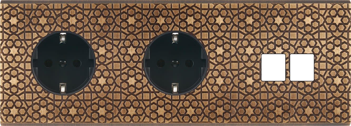 Façade Fascination en laiton massif finition Atlas triple horizontale 1 prise Schuko 1 prise Schuko 2 Media . Dimensions : 222x80x5mm, deux chanfreins biseautés. Fabriqué en France, dans les ateliers de Steaven Richard.