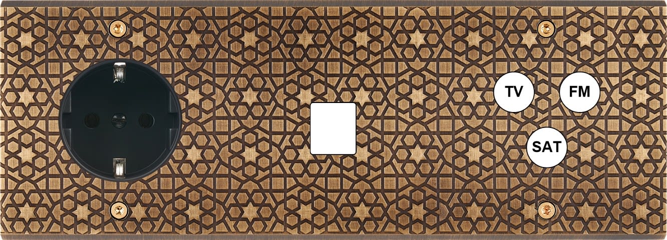 Façade Fascination en laiton massif finition Atlas triple horizontale 1 prise Schuko 1 Media TVFMSAT à vis. Dimensions : 222x80x5mm, deux chanfreins biseautés. Fabriqué en France, dans les ateliers de Steaven Richard.