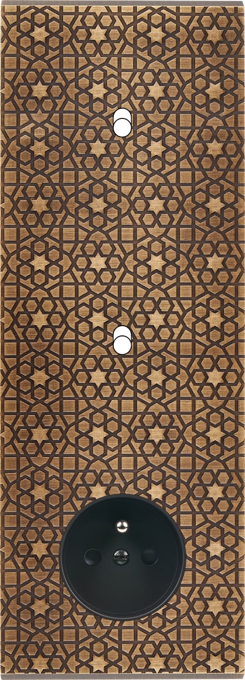 Façade Fascination en laiton massif finition Atlas triple verticale 1 basculeur 1 basculeur prise 2P+T. Dimensions : 80x222x5mm, deux chanfreins biseautés. Fabriqué en France, dans les ateliers de Steaven Richard.