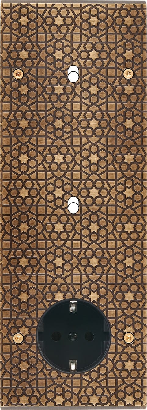Façade Fascination en laiton massif finition Atlas triple verticale 1 Basculeur 1 Basculeur 1 prise Schuko à vis. Dimensions : 80x222x5mm, deux chanfreins biseautés. Fabriqué en France, dans les ateliers de Steaven Richard.