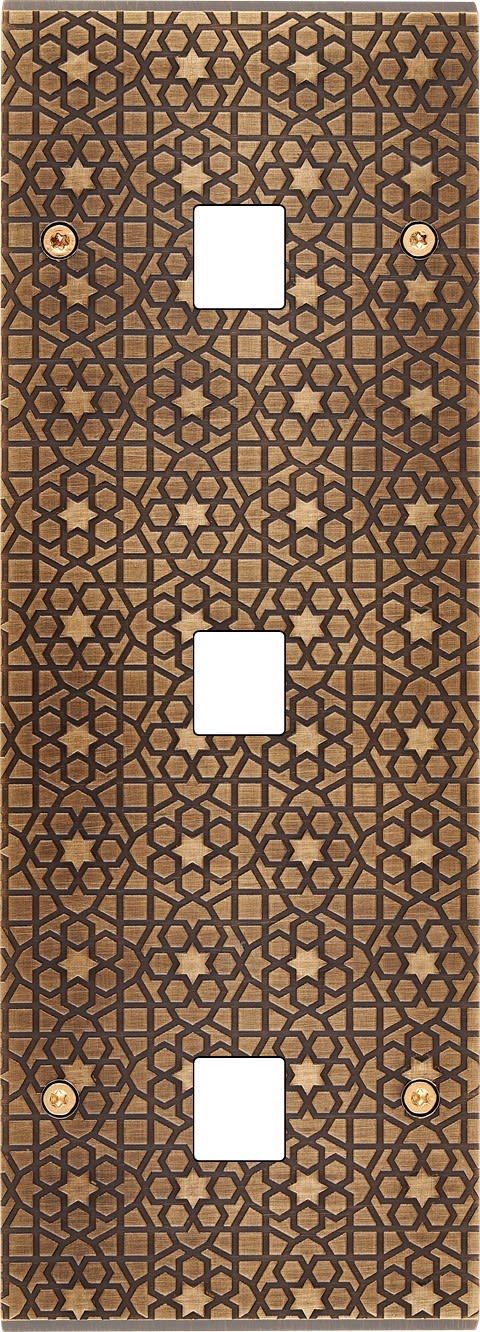 Façade Fascination en laiton massif finition Atlas triple verticale 1 média 1 média 1 média à vis. Dimensions : 80x222x5mm, deux chanfreins biseautés. Fabriqué en France, dans les ateliers de Steaven Richard.