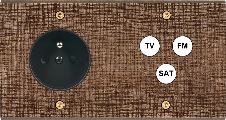Façade Fascination en laiton massif finition Coslan double horizontale prise de courant 2P+T 1 TV-FM-SAT à vis. Dimensions : 151x80x5mm, deux chanfreins biseautés. Fabriqué en France, dans les ateliers de Steaven Richard.