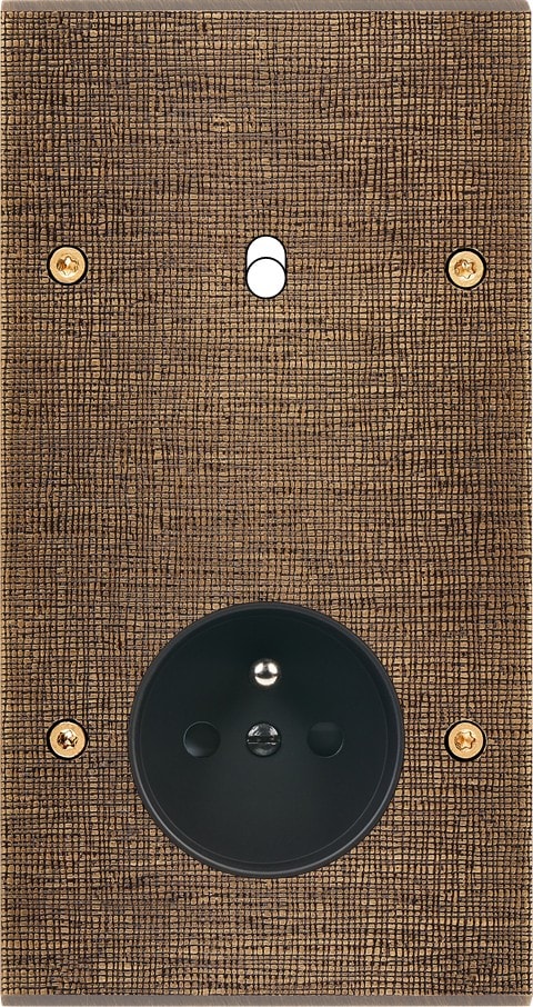 Façade Fascination en laiton massif finition Coslan double verticale 1 basculeur prise de courant 2P+T à vis. Dimensions : 80x151x5mm, deux chanfreins biseautés. Fabriqué en France, dans les ateliers de Steaven Richard.