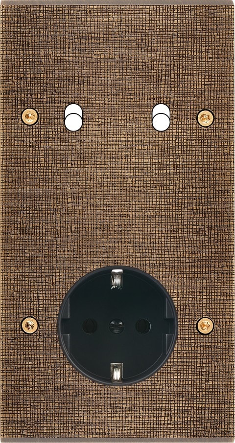 Façade Fascination en laiton massif finition Coslan double verticale 2 Basculeurs 1 prise Schuko à vis. Dimensions : 151x80x5mm, deux chanfreins biseautés. Fabriqué en France, dans les ateliers de Steaven Richard.