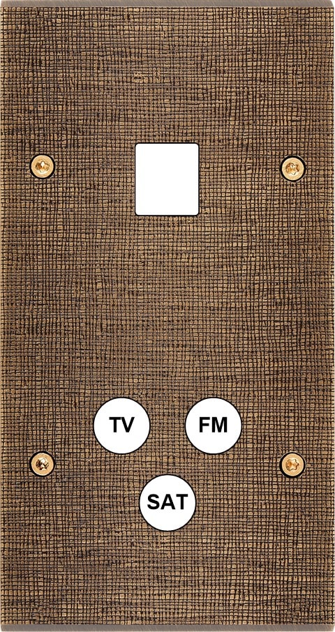 Façade Fascination en laiton massif finition Coslan double verticale 1 média 1 TV-FM-SAT à vis. Dimensions : 80x151x5mm, deux chanfreins biseautés. Fabriqué en France, dans les ateliers de Steaven Richard.
