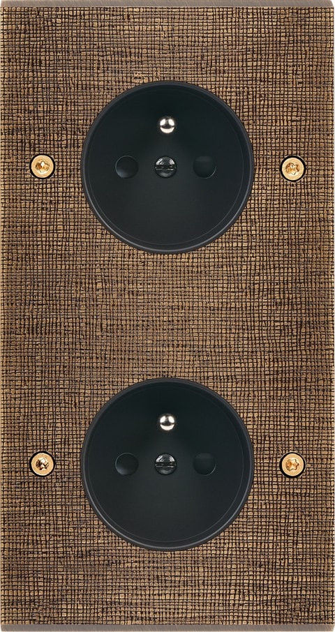 Façade Fascination en laiton massif finition Coslan double verticale prise de courant 2P+T prise de courant 2P+T à vis. Dimensions : 151x80x5mm, deux chanfreins biseautés. Fabriqué en France, dans les ateliers de Steaven Richard.