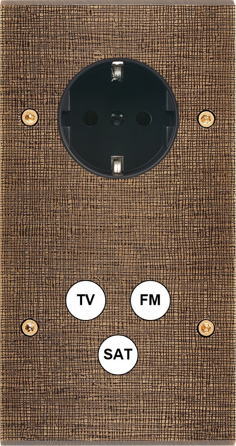 Façade Fascination en laiton massif finition Coslan double verticale 1 prise Schuko TVFMSAT à vis. Dimensions : 151x80x5mm, deux chanfreins biseautés. Fabriqué en France, dans les ateliers de Steaven Richard.