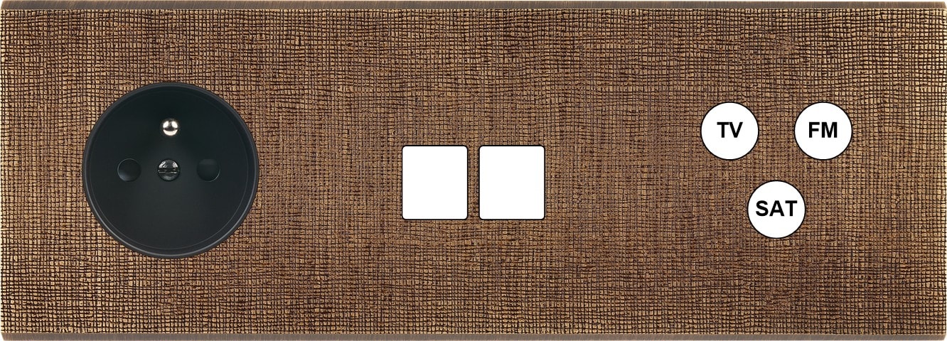 Façade Fascination en laiton massif finition Coslan triple horizontale prise 2P+T 2 Media TV-FM-SAT magnétique. Dimensions : 222x80x5mm, deux chanfreins biseautés. Fabriqué en France, dans les ateliers de Steaven Richard.