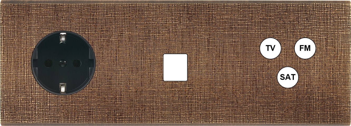 Façade Fascination en laiton massif finition Coslan triple horizontale 1 prise Schuko 1 Media TVFMSAT . Dimensions : 222x80x5mm, deux chanfreins biseautés. Fabriqué en France, dans les ateliers de Steaven Richard.