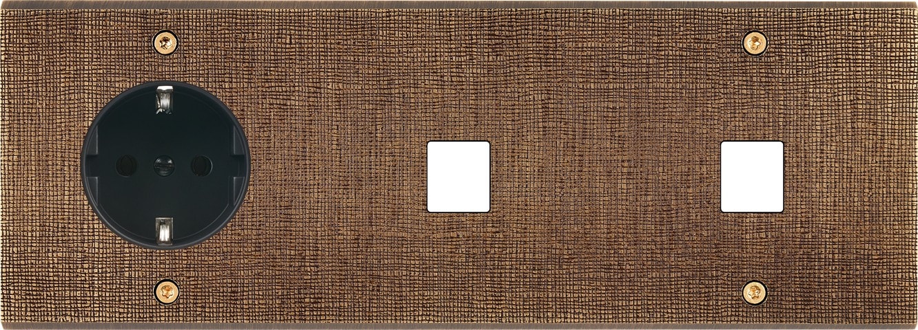 Façade Fascination en laiton massif finition Coslan triple horizontale 1 prise Schuko 1 Media 1 Media à vis. Dimensions : 222x80x5mm, deux chanfreins biseautés. Fabriqué en France, dans les ateliers de Steaven Richard.