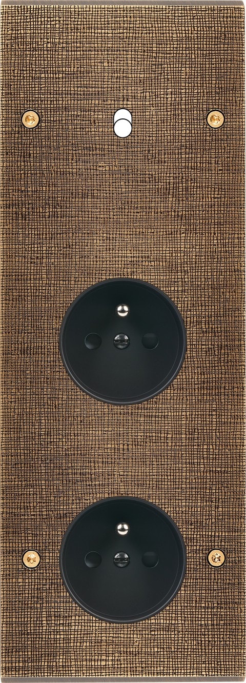 Façade Fascination en laiton massif finition Coslan triple verticale 1 basculeur prise de courant 2P+T prise de courant 2P+T à vis. Dim : 80x222x5mm, deux chanfreins biseautés. Fabriqué en France, dans les ateliers de Steaven Richard.