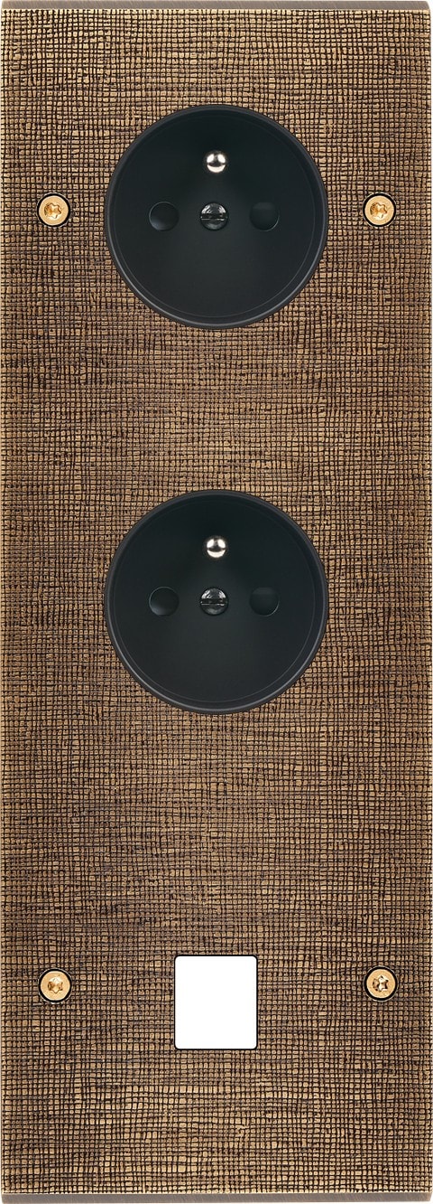 Façade Fascination en laiton massif finition Coslan triple verticale prise de courant 2P+T prise de courant 2P+T 1 média à vis. Dimensions : 80x222x5mm, deux chanfreins biseautés. Fabriqué en France, dans les ateliers de Steaven Richard.