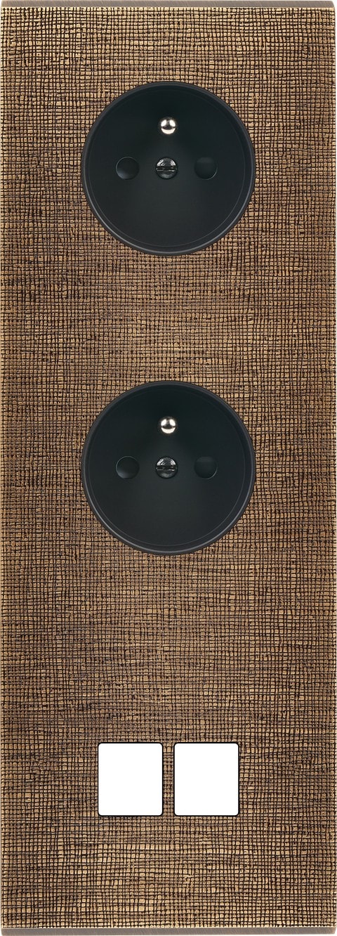 Façade Fascination en laiton massif finition Coslan triple verticale prise 2P+T prise 2P+T 2 Media magnétique. Dimensions : 80x222x5mm, deux chanfreins biseautés. Fabriqué en France dans les ateliers de Steaven Richard.