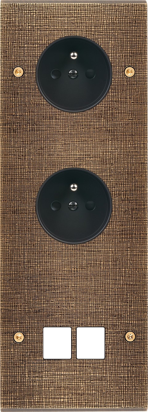 Façade Fascination en laiton massif finition Coslan triple verticale prise de courant 2P+T prise de courant 2P+T 2 média à vis. Dimensions : 80x222x5mm, deux chanfreins biseautés. Fabriqué en France, dans les ateliers de Steaven Richard.