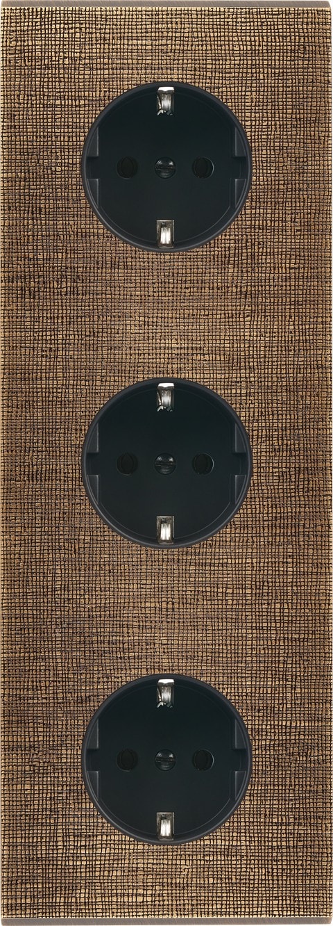Façade Fascination en laiton massif finition Coslan triple verticale 1 prise Schuko 1 prise Schuko 1 prise Schuko . Dimensions : 80x222x5mm, deux chanfreins biseautés. Fabriqué en France, dans les ateliers de Steaven Richard.
