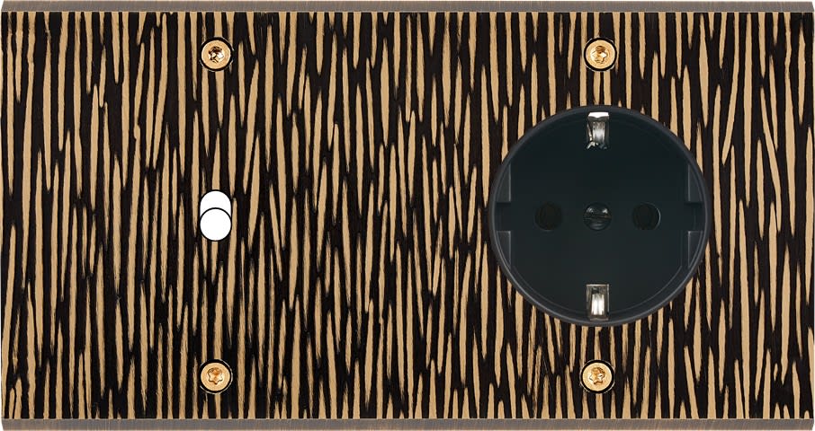 Façade Fascination en laiton massif finition Fauve double horizontale 1 Basculeur 1 prise Schuko à vis. Dimensions : 151x80x5mm, deux chanfreins biseautés. Fabriqué en France, dans les ateliers de Steaven Richard.