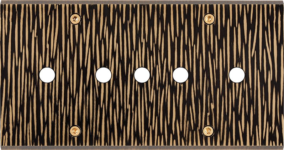 Façade Fascination en laiton massif finition Fauve double horizontale 5 boutons poussoir PUSH à vis. Dimensions : 151x80x5mm, deux chanfreins biseautés. Fabriqué en France, dans les ateliers de Steaven Richard.