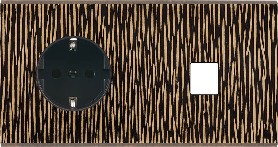Façade Fascination en laiton massif finition Fauve double horizontale 1 prise Schuko 1 MEDIA magnétique. Dimensions : 80x80x5mm, deux chanfreins biseautés. Fabriqué en France, dans les ateliers de Steaven Richard.