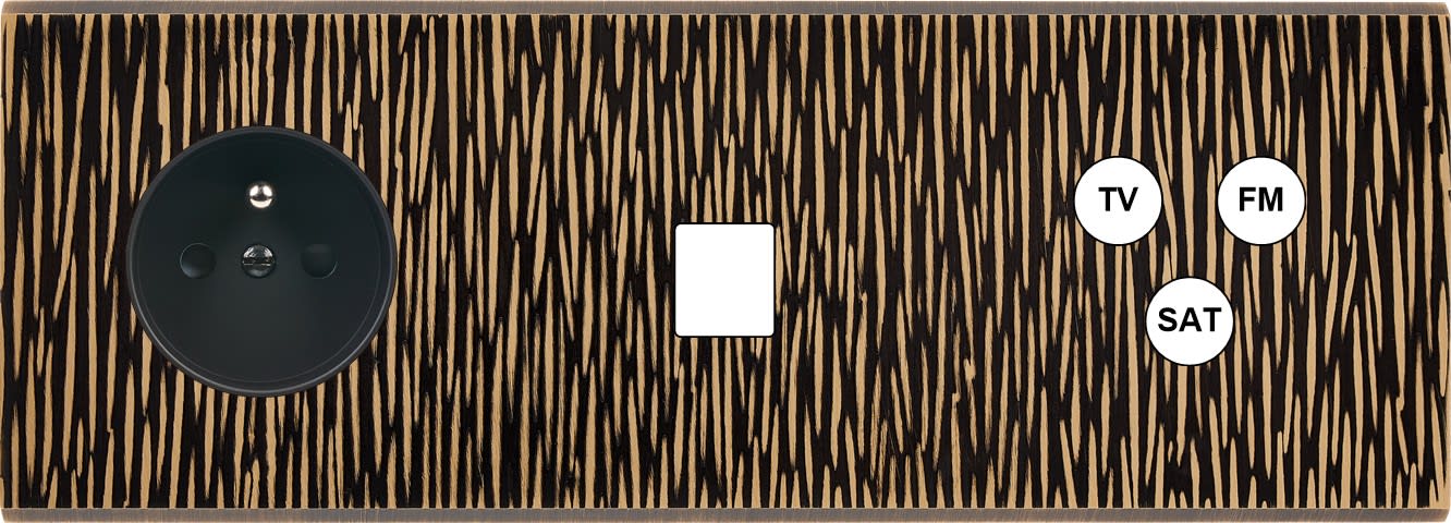 Façade Fascination en laiton massif finition Fauve triple horizontale prise 2P+T 1 Media TV-FM-SAT magnétique. Dimensions : 222x80x5mm, deux chanfreins biseautés. Fabriqué en France, dans les ateliers de Steaven Richard.