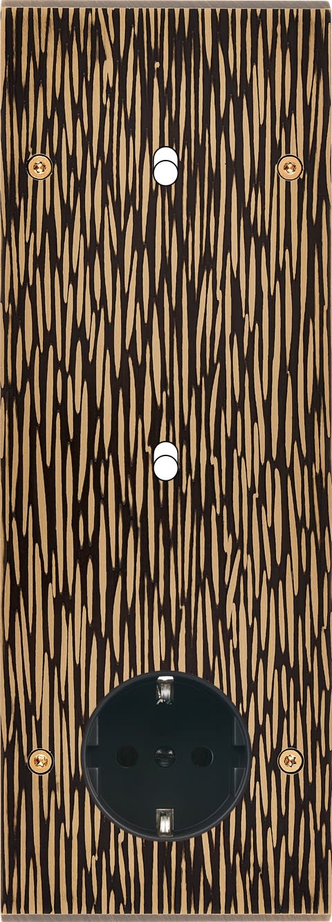 Façade Fascination en laiton massif finition Fauve triple verticale 1 Basculeur 1 Basculeur 1 prise Schuko à vis. Dimensions : 80x222x5mm, deux chanfreins biseautés. Fabriqué en France, dans les ateliers de Steaven Richard.