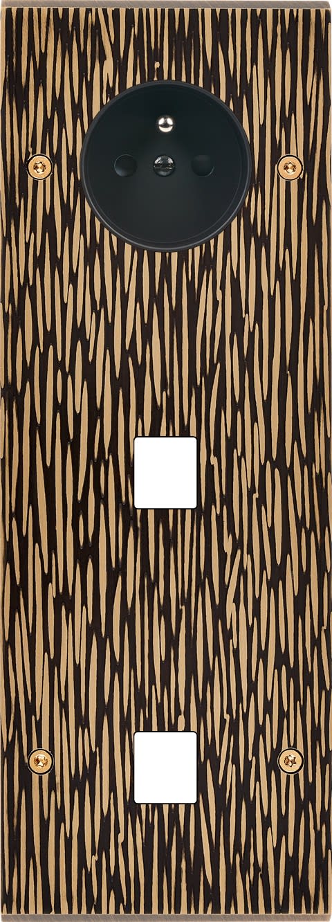 Façade Fascination en laiton massif finition Fauve triple verticale prise de courant 2P+T 1 média 1 média à vis. Dimensions : 80x222x5mm, deux chanfreins biseautés. Fabriqué en France, dans les ateliers de Steaven Richard.